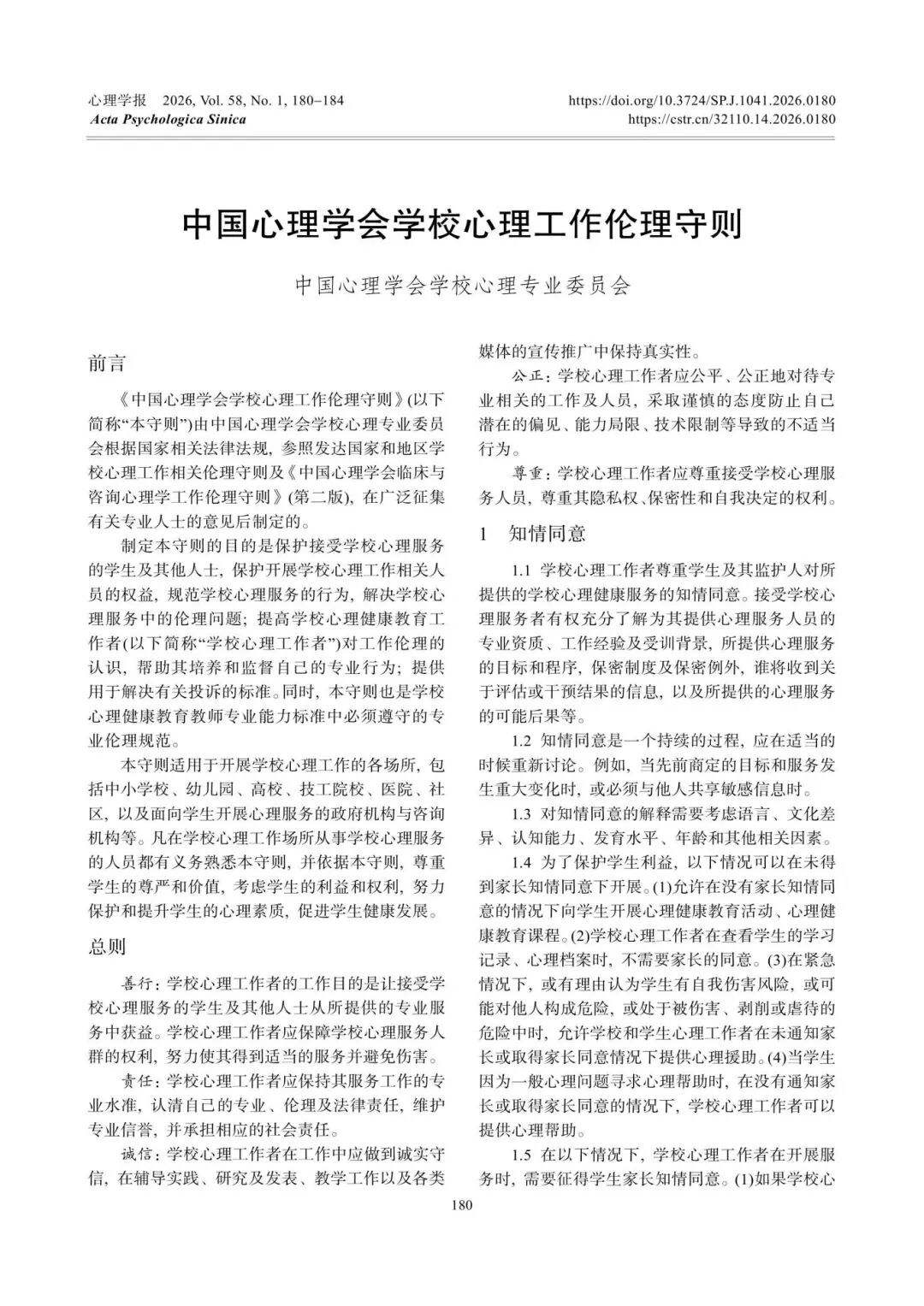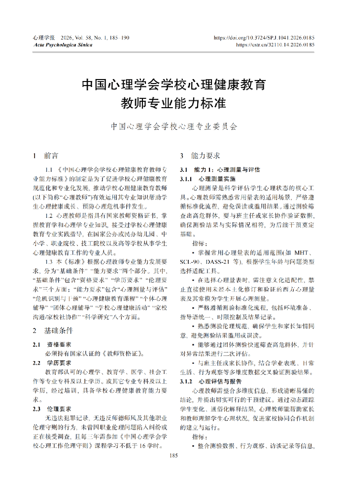 近日,中国心理学会学校心理专业委员会正式发布了两份关键文件:《学校心理健康教育教师专业能力标准》与《学校心理工作伦理守则》。《学校心理健康教育教师专业能力标准》明确了心理健康教师的专业要求,为培养和选拔人才提供了依据;《学校心理工作伦理守则》为心理工作划定了伦理边界,重点强调保护学生隐私和福祉,标志着...近日,中国心理学会学校心理专业委员会正式发布了两份关键文件:《学校心理健康教育教师专业能力标准》与《学校心理工作伦理守则》。